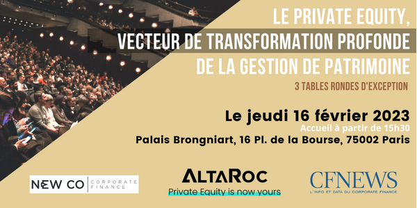 CFNEWS and its partners ALTAROC and NEWCO CF are pleased to invite you on February 16 at the Palais Brongniart in Paris to 3 round tables on the theme: Private Equity, a vector of profound transformation in Wealth Management. Private Equity has completely reshaped the Wealth Management landscape in recent years, leading to a massive movement of concentration in the sector, and radically modernizing the financial offer for private clients. Why is this industry of such interest to Private Equity players? Will the market continue to consolidate? Will CGP valuations continue to rise? Is there a future for French CGPs internationally? Will their size eventually exceed that of private banks? Why are the most innovative Wealth Management Advisors talking more and more about Private Equity to their clients? How do they structure their offerings? What share will Private Equity represent in asset allocations in the next 5 years? Why has Private Equity only developed very recently within French life insurance? What are the complexities and challenges? How does the combination of a Private Equity offer in life insurance reshuffle the cards of the asset offer? So many questions that major personalities in Wealth Management and Insurance will endeavor to answer during these 3 round tables CFNEWS – ALTAROC – NEWCO CF